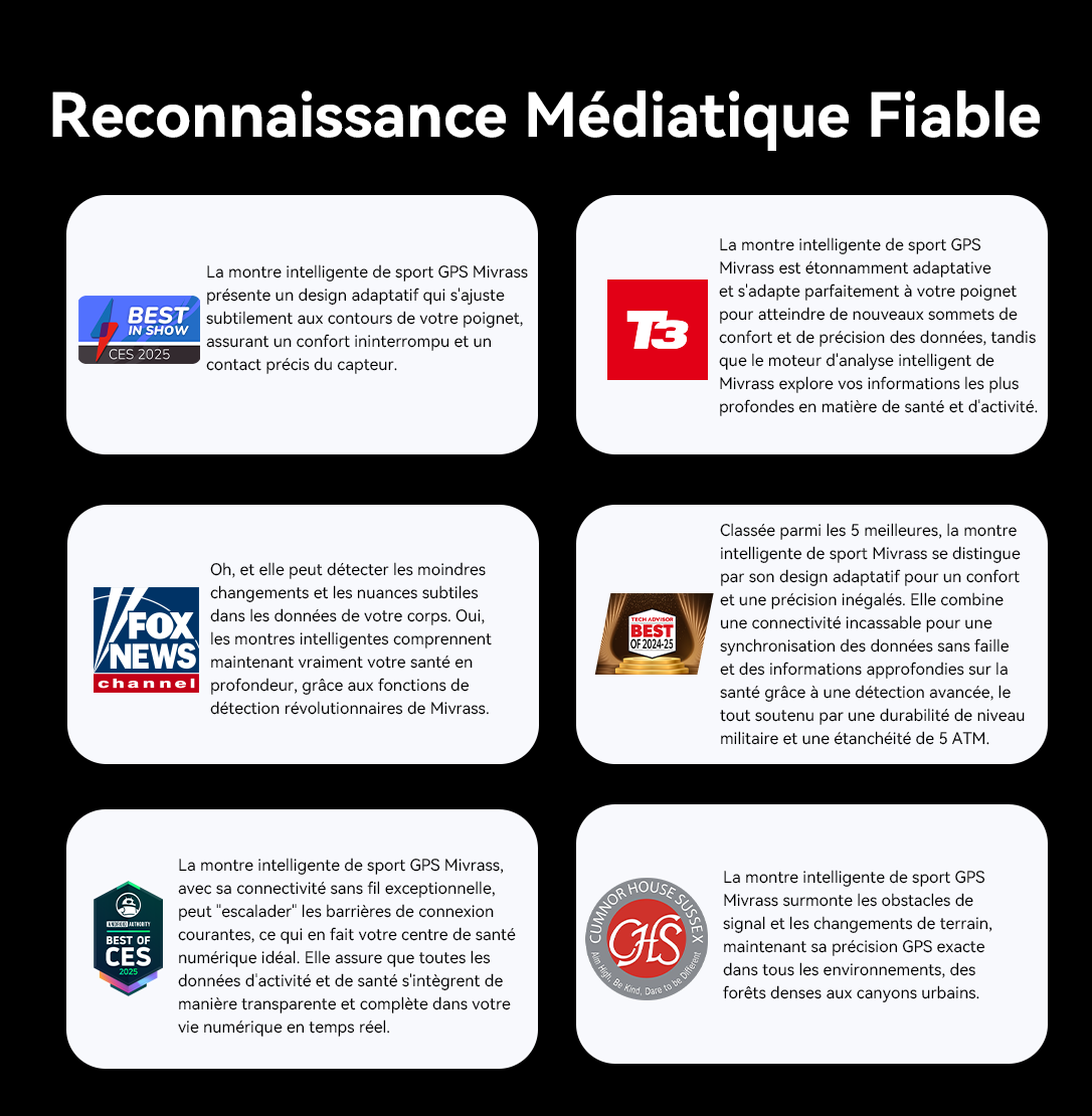 - Gardien de santé 24/7 : Surveillance en temps réel de la fréquence cardiaque, de l'oxygène sanguin et du stress pour des alertes de sécurité.