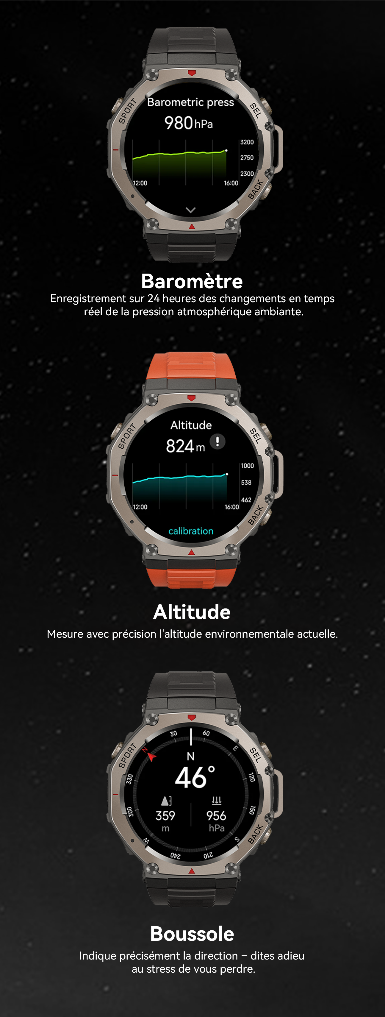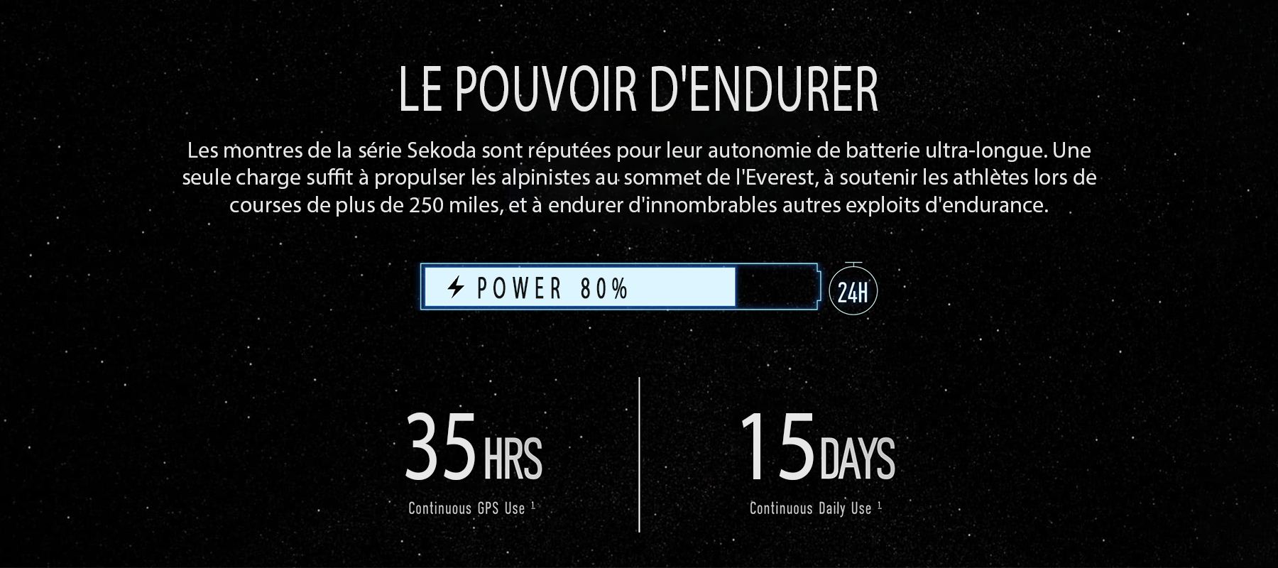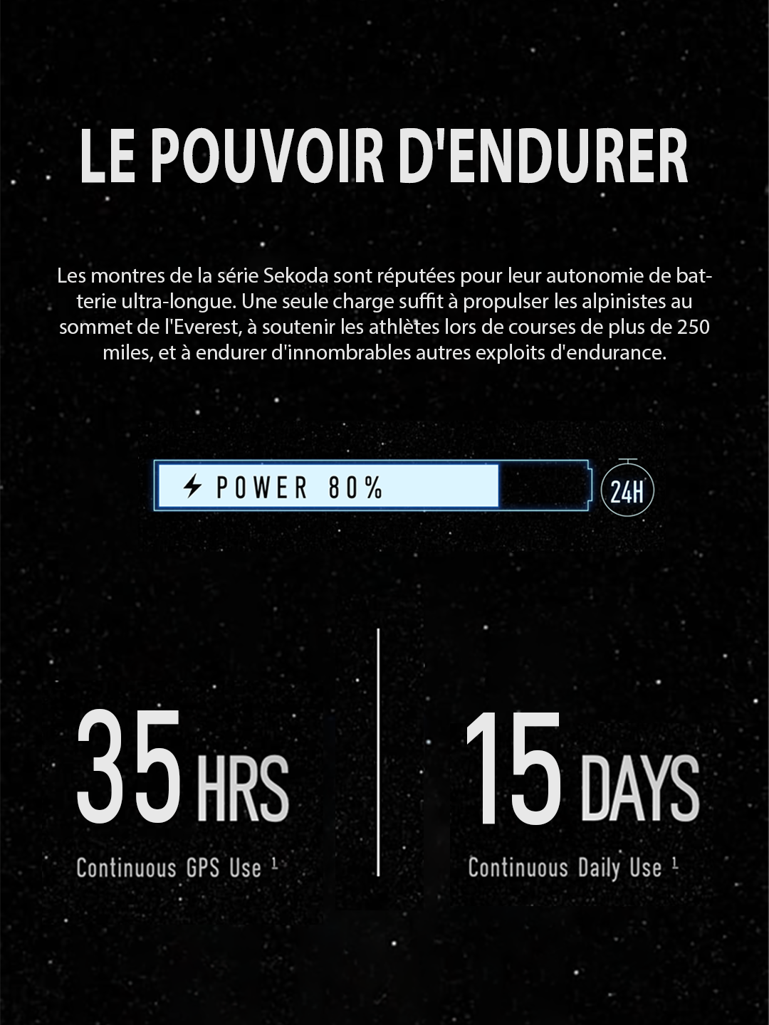 - Autonomie de batterie ultra-longue : La puissante batterie offre 15 jours d'utilisation quotidienne ou 35 heures en mode GPS.